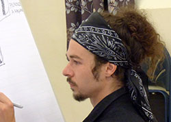 Qu’à cela ne tienne, nous caressons le papier pour étaler les pigments, nous en rajoutons, nous changeons nos couleurs et petit à petit nous sommes sur la voie de trouver le bon geste. |