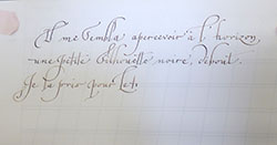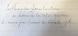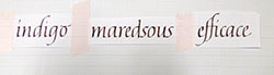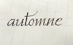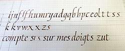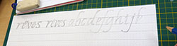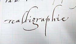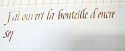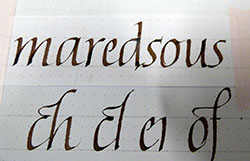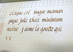 Cette belle graphie se prête bien aux ligatures et nos recherches vont nous mener à trouver des variations qui vont nous ravir.Remplir notre plume d’encre avec le pinceau, point trop, ni trop peu et écrire … |