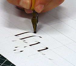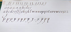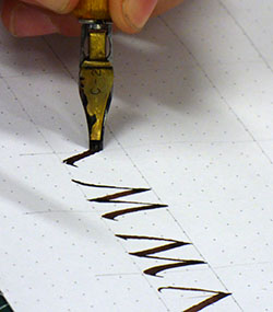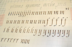 Geneviève nous propose de nous approprier le tracé des différents signes. Nous débutons à la plume plate, ensuite à la plume palette. Isolés au départ, chaque signe sera relié avec le suivant par le bas. Cette écriture, à l’origine s’écrit de droite à gauche, nous nous la traçons de gauche à droite. Exigence pour débuter, arrêter et tirer nos traits. |